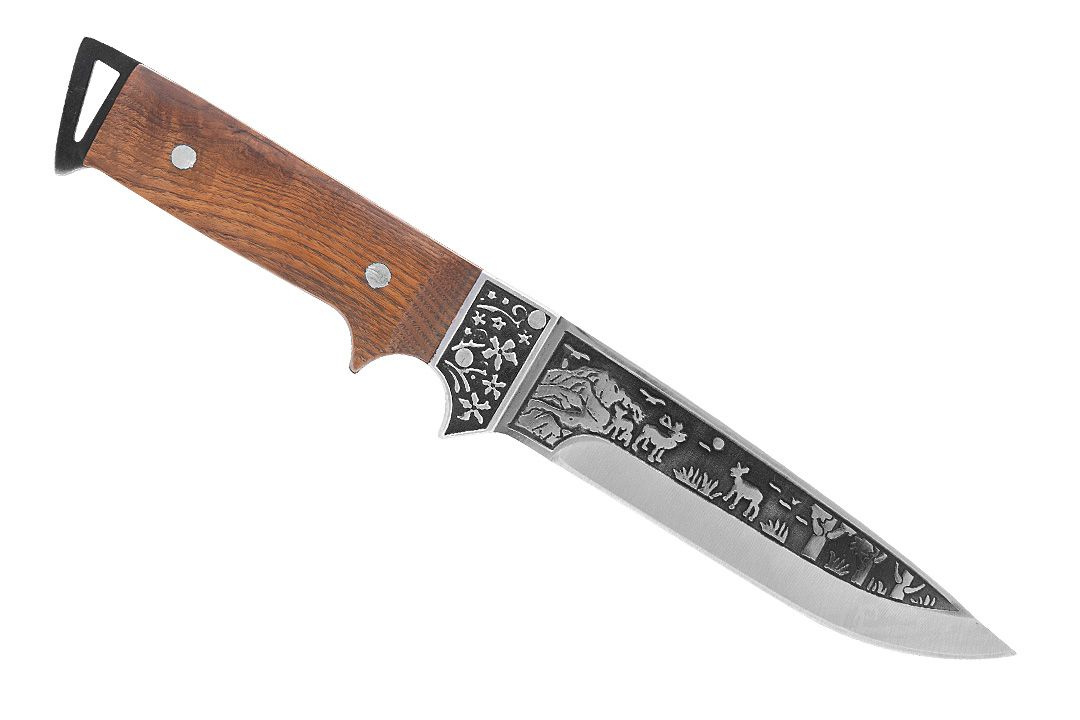 Čepel: Vyrobena z vysoce kvalitní nerezové oceli 440 a zdobena detailní rytinou jelena v lesní krajině.