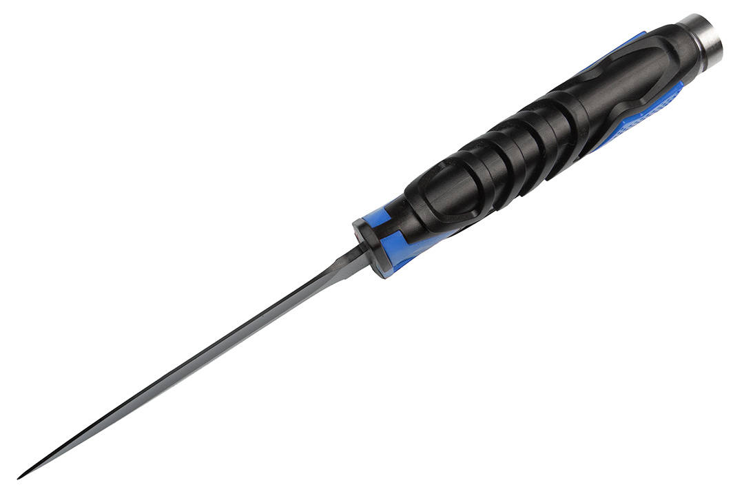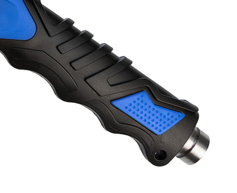Ergonomická, protiskluzová rukojeť s modrými akcenty je vyrobena z kombinace extrémně odolného ABS plastu a materiálu podobného gumě .