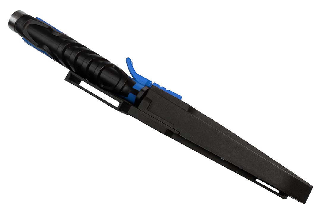 Pouzdro má také otvory pro odtok vody a pružinovou západku, která zabraňuje vypadnutí nože a umožňuje jeho rychlé vyjmutí v případě nouze.